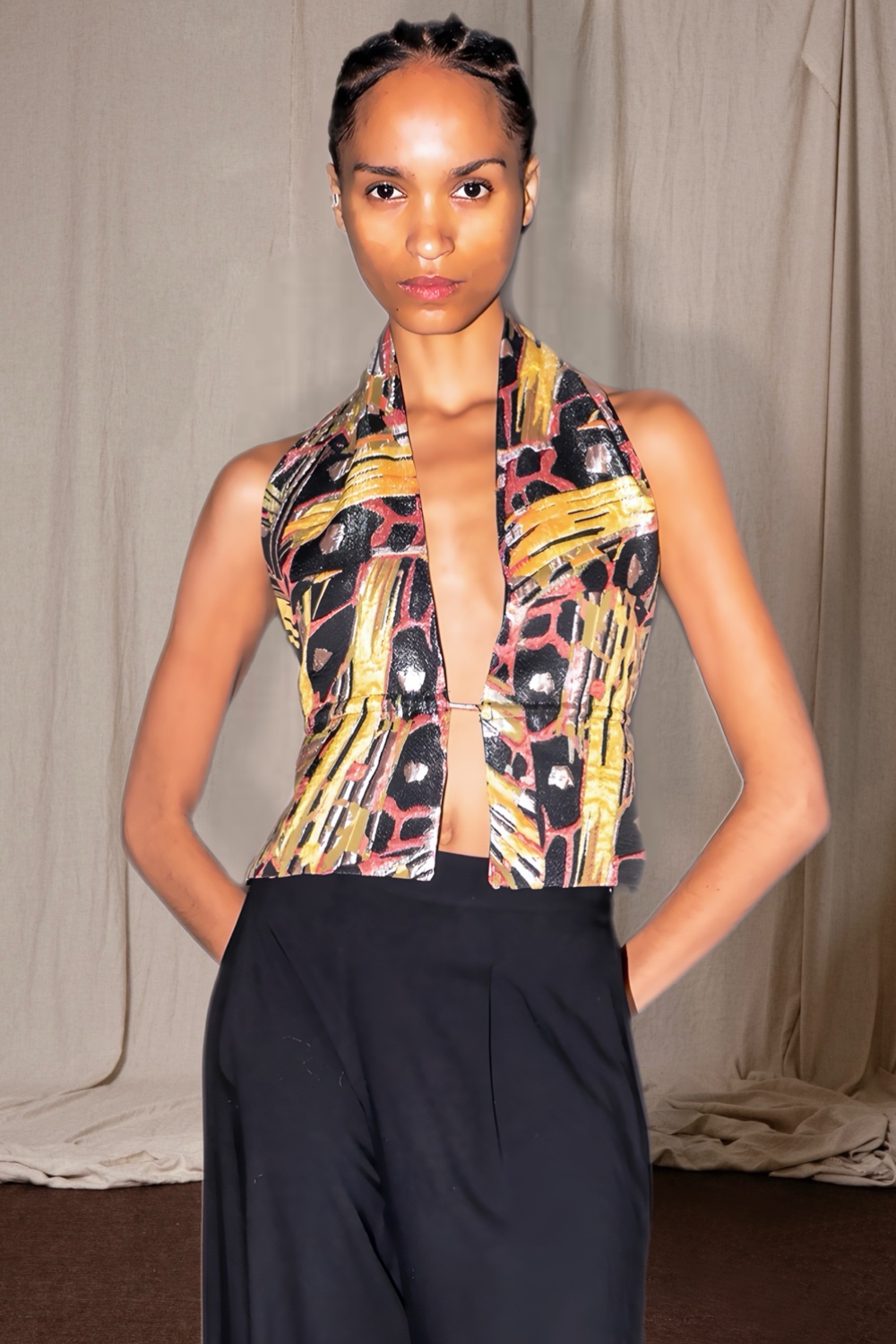 WILD SOPHISTICATION büstiyer karakterini tek tarafa sığdıramayanlar için tasarlandı. Bir tarafında pantolonla tam uyumlu, düz ve güçlü siyah ton; diğer tarafında ise göz alıcı, parlak desenli özel bir dokuma kumaş var. Zıtlıkları üzerinde taşımak isteyenler için: sadelik ve ihtişam, aynı bedende buluşuyor.