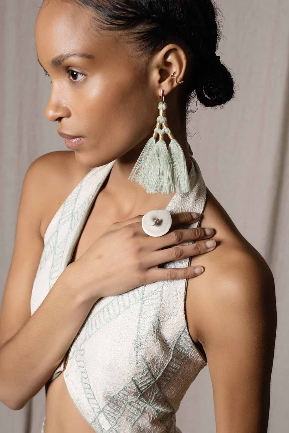 Bu yelek formundaki üst, koleksiyonun dönüşebilir ruhunu en zarif haliyle yansıtır. İki yönlü giyilebilen yapısıyla, bir yüzü eteğin grafik desenini taşırken, diğer yüzü desenin içindeki ana tonları öne çıkarır. Ön kısmı sade, modern çizgilerle şekillenirken; sırtında yer alan güçlü açıklık detayı parçaya sofistike bir feminenlik kazandırır. Gold aksesuar detaylarla tamamlanan bu tasarım, gece ve gündüz kombinlerinde kolayca dönüşebilir bir kimlik sunar.