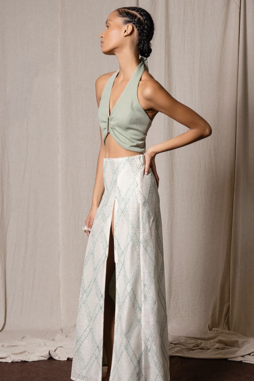 Zarafetin sınırlarını cesaretle zorlayan bu etek, detaylarında gizli bir oyun barındırıyor. Eteğin ön sol kısmında yer alan gizli fermuar, yırtmacın açıklığını tamamen senin tercihlerine bırakıyor. İstersen zarif bir siluetle tamamen kapalı, istersen adım attıkça açığa çıkan hafif bir açıklık, istersen de özgür bir duruşla tamamen açık…Modern, kavisli kesimi ve akıcı kumaşı sayesinde her hareketine anlam katıyor. Sade görünen bir parça içinde güçlü bir ifade