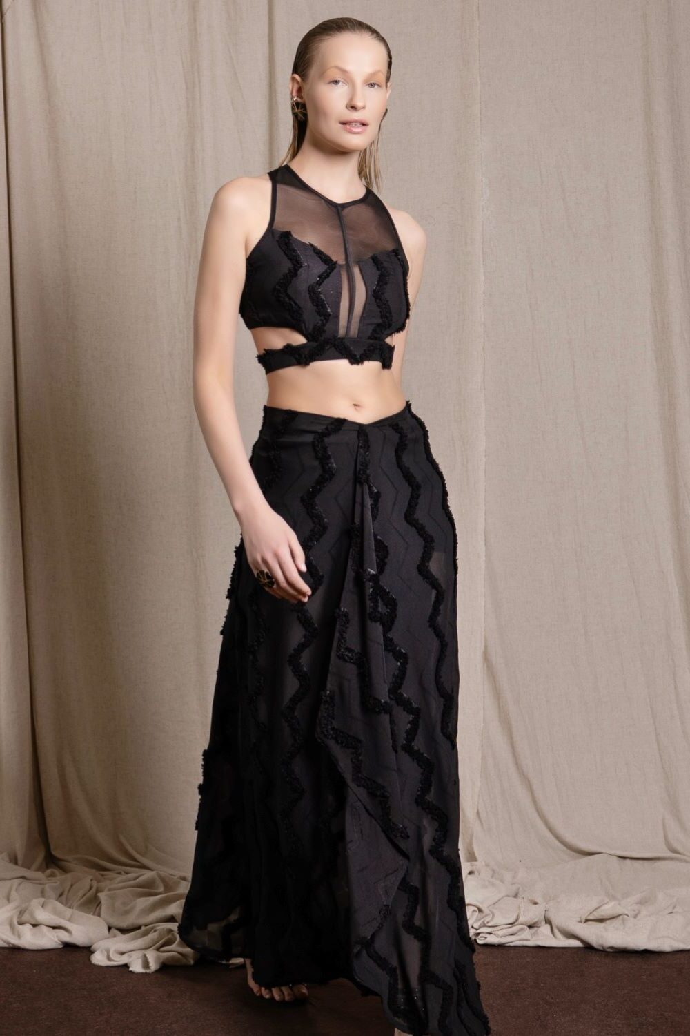 Onu taşımak Cesaret İster. Silent Blaze koleksiyonunun en çarpıcı parçalarından biri. Yüzücü yaka formu ve keskin omuz hatları, tül ile dengelenmiş derin bir dekolteyle buluşuyor. Göğüsleri kaplayan sert kumaş geçişleri, bu parçayı yalnızca cesur kadınların taşıyabileceğini fısıldıyor. Çünkü onu giymek değil, taşımak mesele. Gizemli sırt dekoltesi; tamamen açık olmadan, iki farklı noktada birleşip ayrılarak merak uyandırıyor. İçindeki gücü ortaya koyarak, her adımında farkını gösteren bir tasarım.