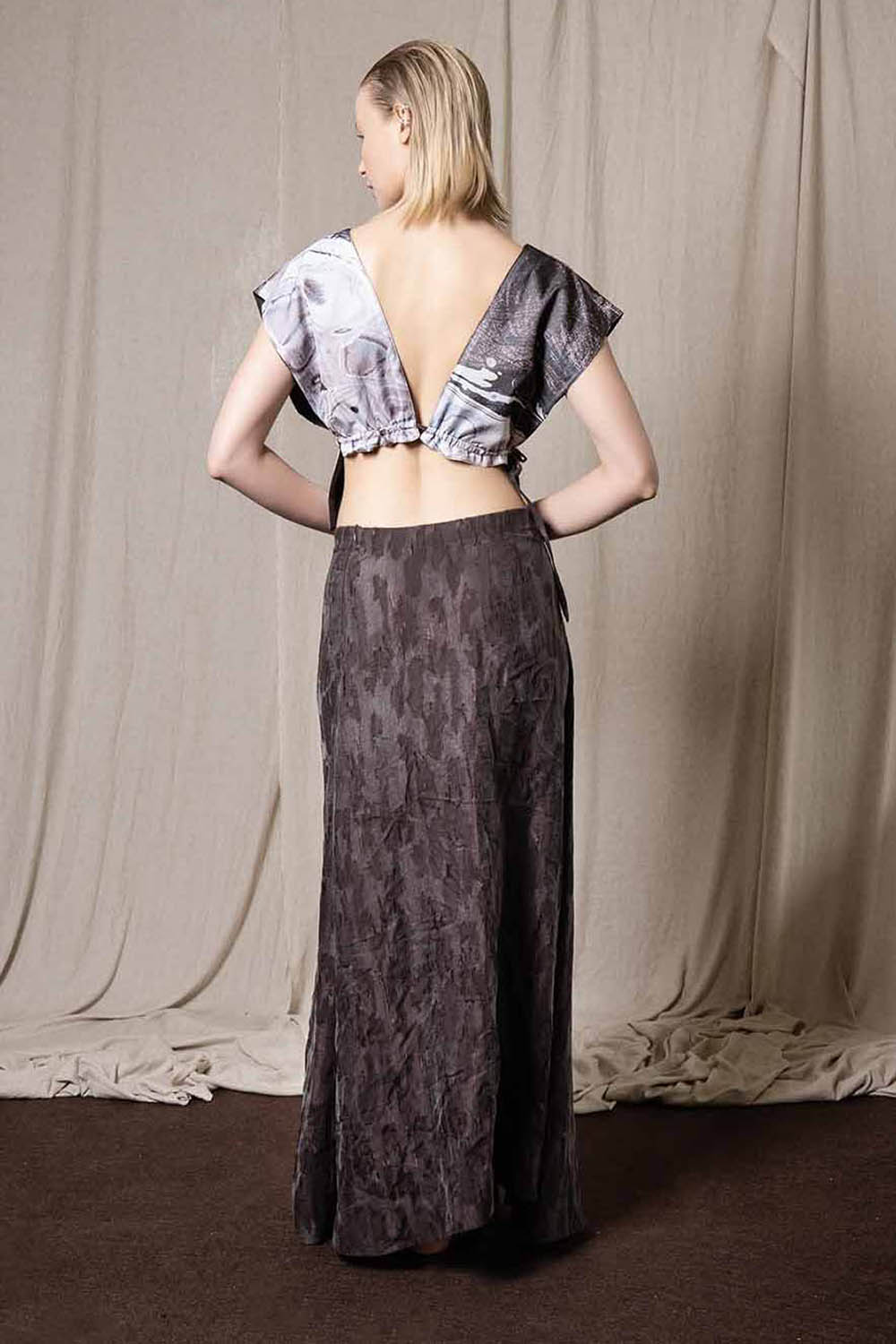 Adımlarınla birlikte şekillenen bir siluet…Bu etek, sen yürüdükçe seninle uyum içinde hareket eder; çünkü derin yırtmaç detayı, her adımında eteği yeniden tanımlar. Arka lastik detayı, yüksek bel ve düşük bel kullanım seçenekleriyle sana tam özgürlük sunar. Öne doğru inen V kemer kesimi belini zarif ve ince gösterir.%100 organik vegan cupro kumaşıyla dökümlü, özgür ve asi. Seninle sadece hareket etmez; seni yansıtır, seninle birlikte var olur.