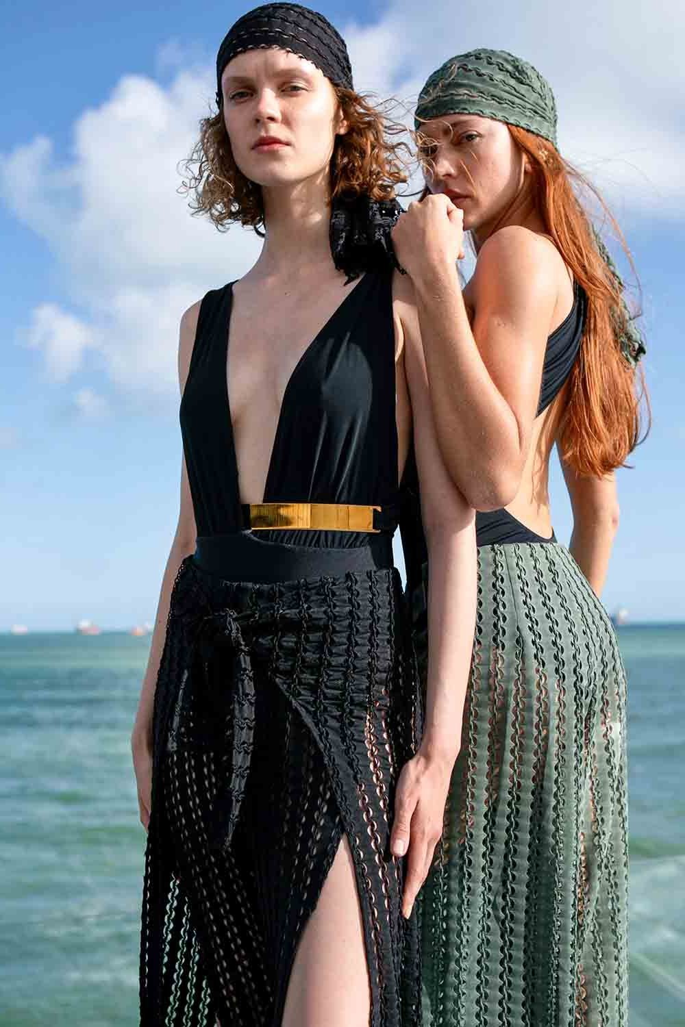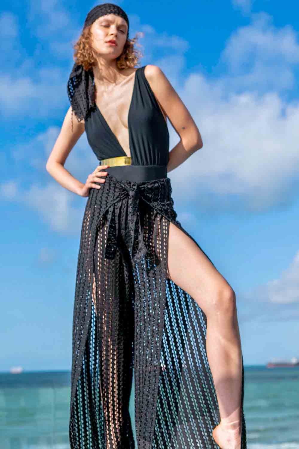 Bazı parçalar, yürüdükçe kendini fısıldar. Her adımda biraz daha gösterir kim olduğunu… İki bacağında yer alan yırtmaçlar, küçük adımlarda gizemini korur; büyük adımlarda cesaretini ortaya koyar. Delikli dokusuyla sınır tanımayan bir şıklık sunar; içindeki tak-çıkar şort sayesinde ister özgürce, ister cesurca… Plaj üstüne, şehir hayatına, geceye, güneşe… Ön kısmında yer alan kendi kumaşından kuşağıyla Medusa’ya ait olduğunu ilk bakışta hissettirir. Bu pantolon, her haliyle kendi yolunu çizen kadınlara ait. Çünkü Medusa, bakışıyla değil, adımıyla dönüştürür.